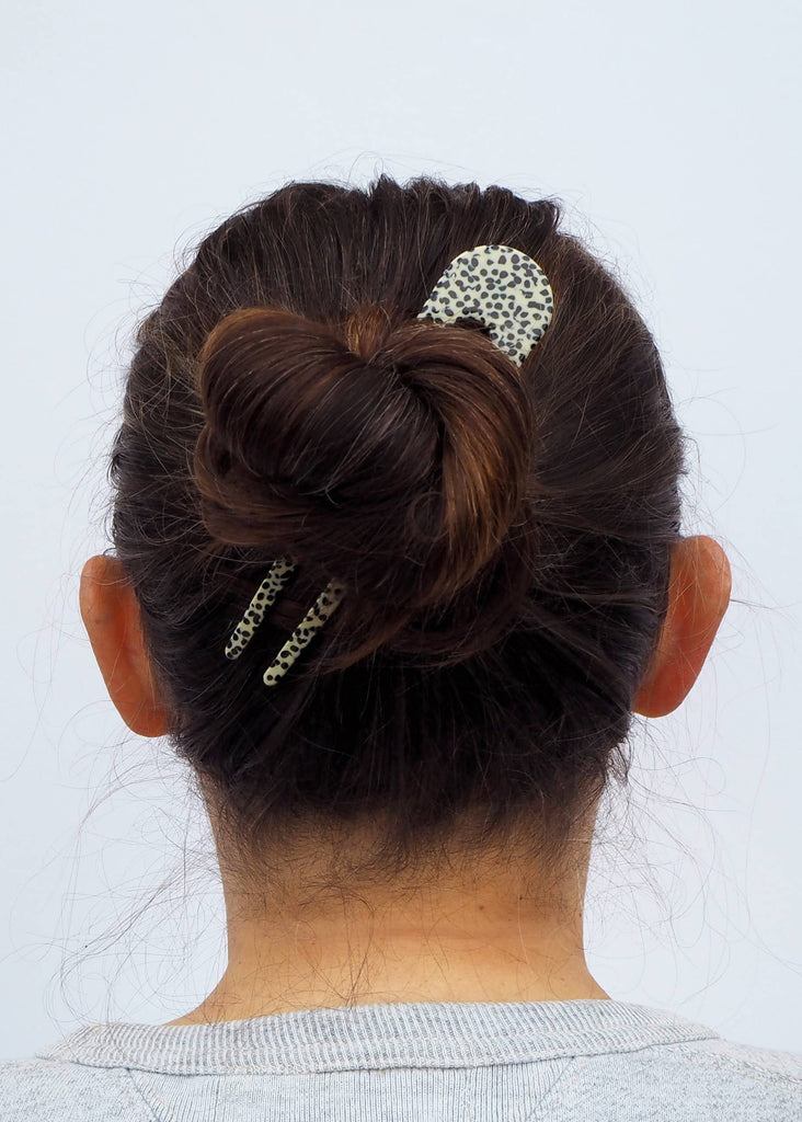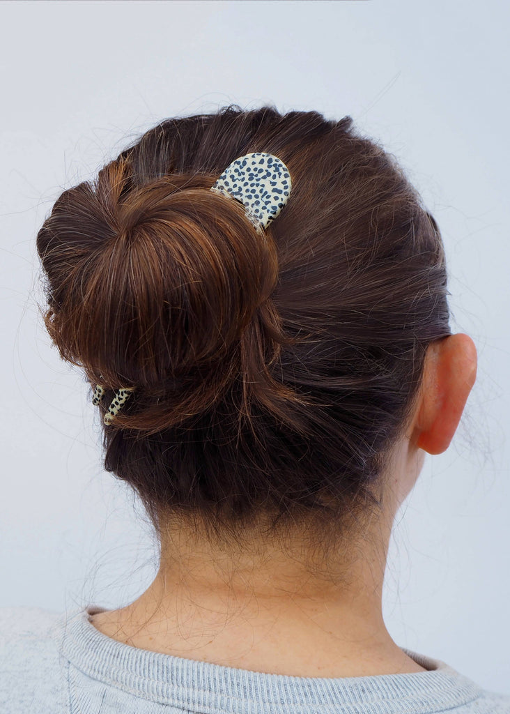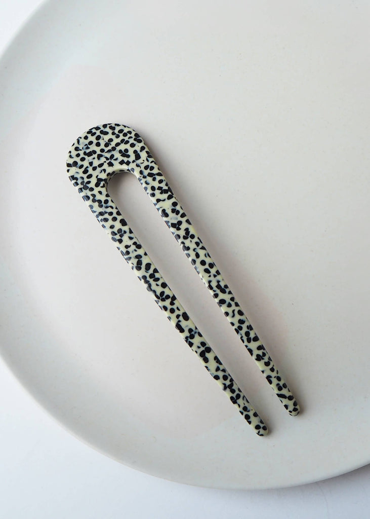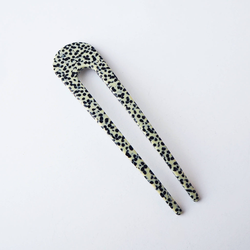 Pretty black and cream terrazzo acetate French hair pin. The beautiful hair pin is made from black and cream marble mix checker acetate. Perfect for taming long hair, for that messy bun look.