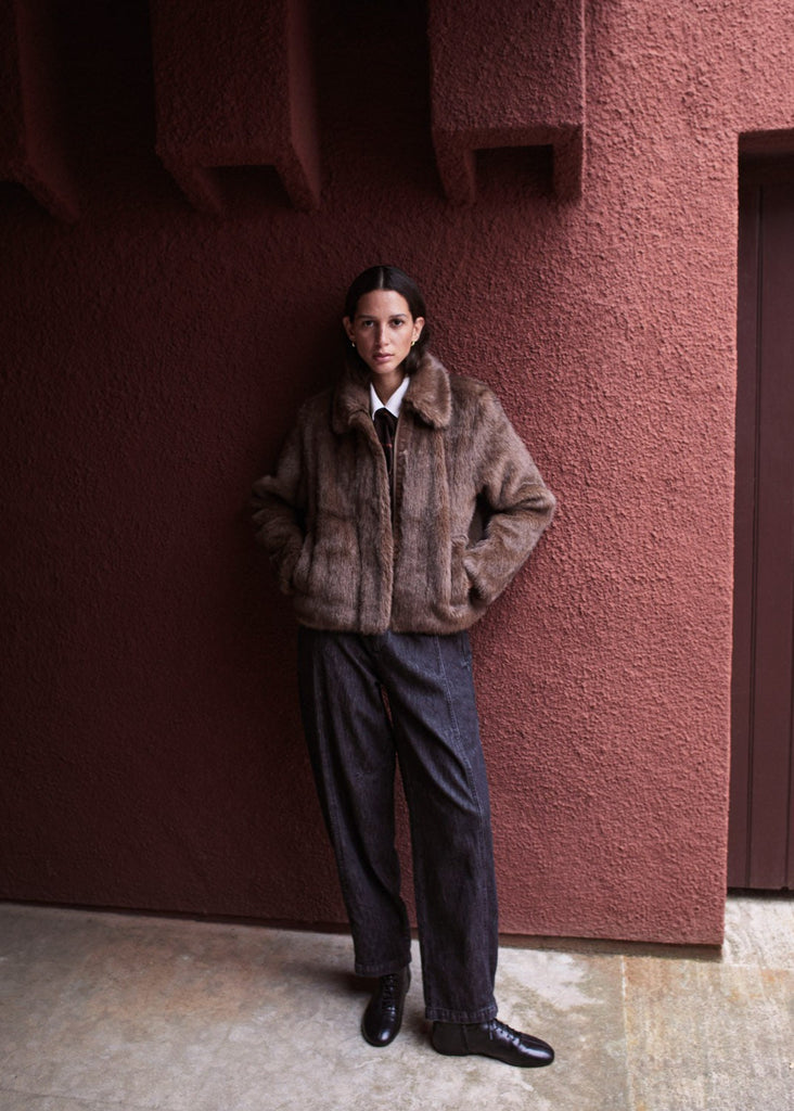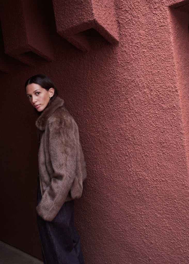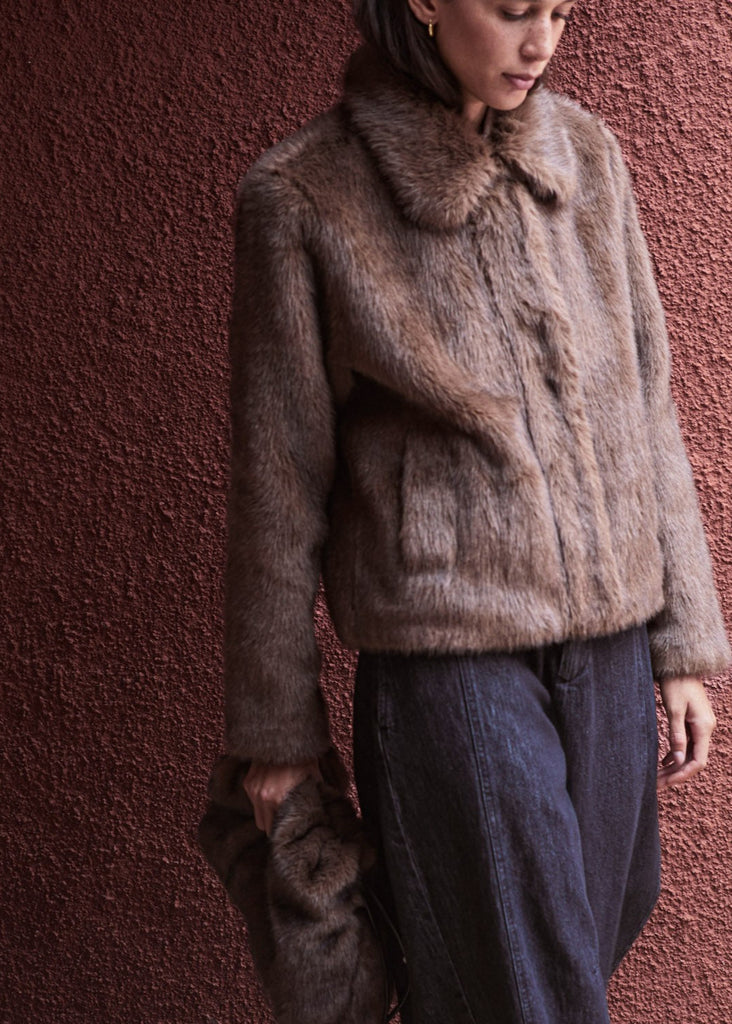 Short regular-fit coat. Faux fur. With lining. Collar. Long sleeves. Zip and snap fastening. Two side pockets.