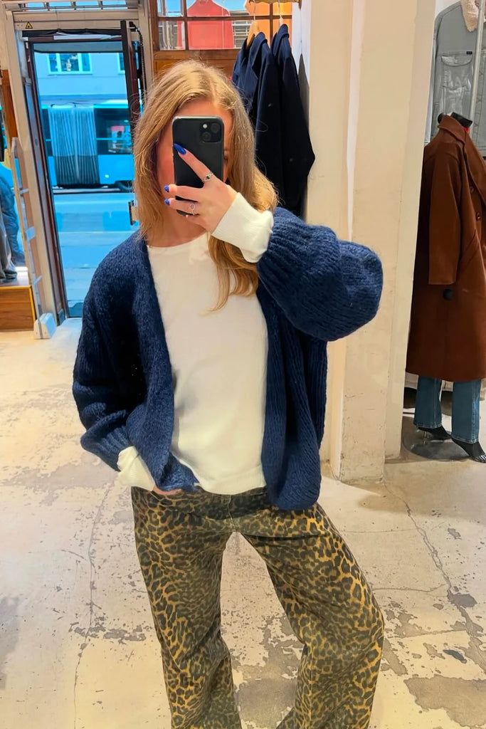 Navy blue classic cardigan with an oversized, relaxed silhouette. Thick, warm, soft, cuddly, and silky to the touch. Creates a casual and cosy look. The open cardigan fits well with jeans, trousers, or with a skirt or a light dress. Thanks to the mohair blend, the cardigan is comfortable to wear in any weather.
