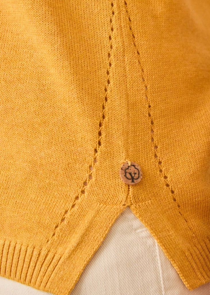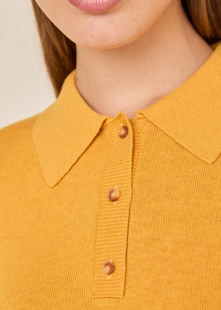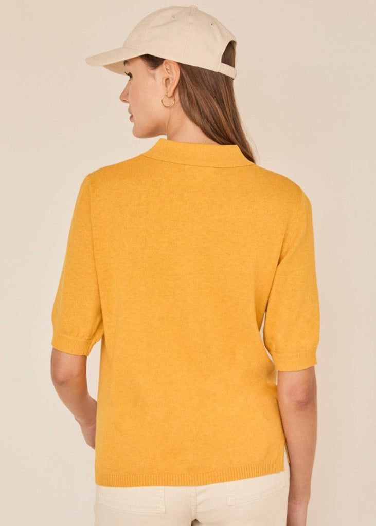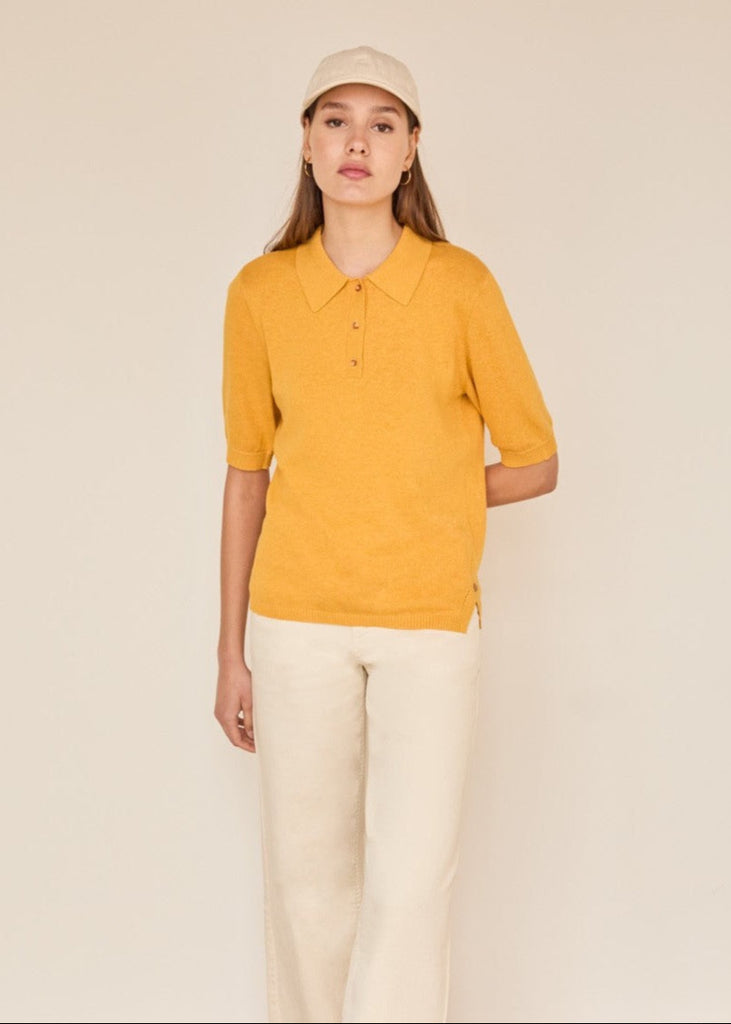 Short-sleeve sweater with polo neck and fretwork on the sides.