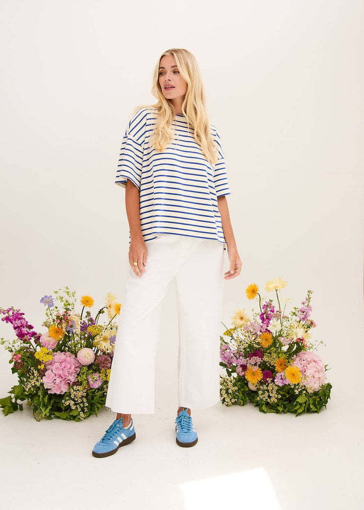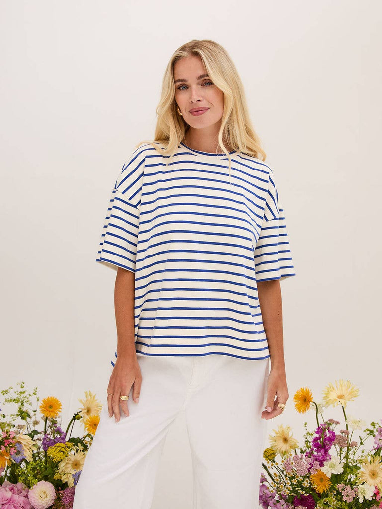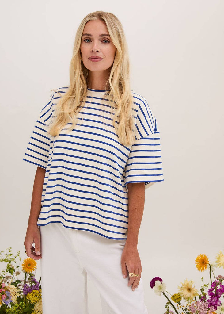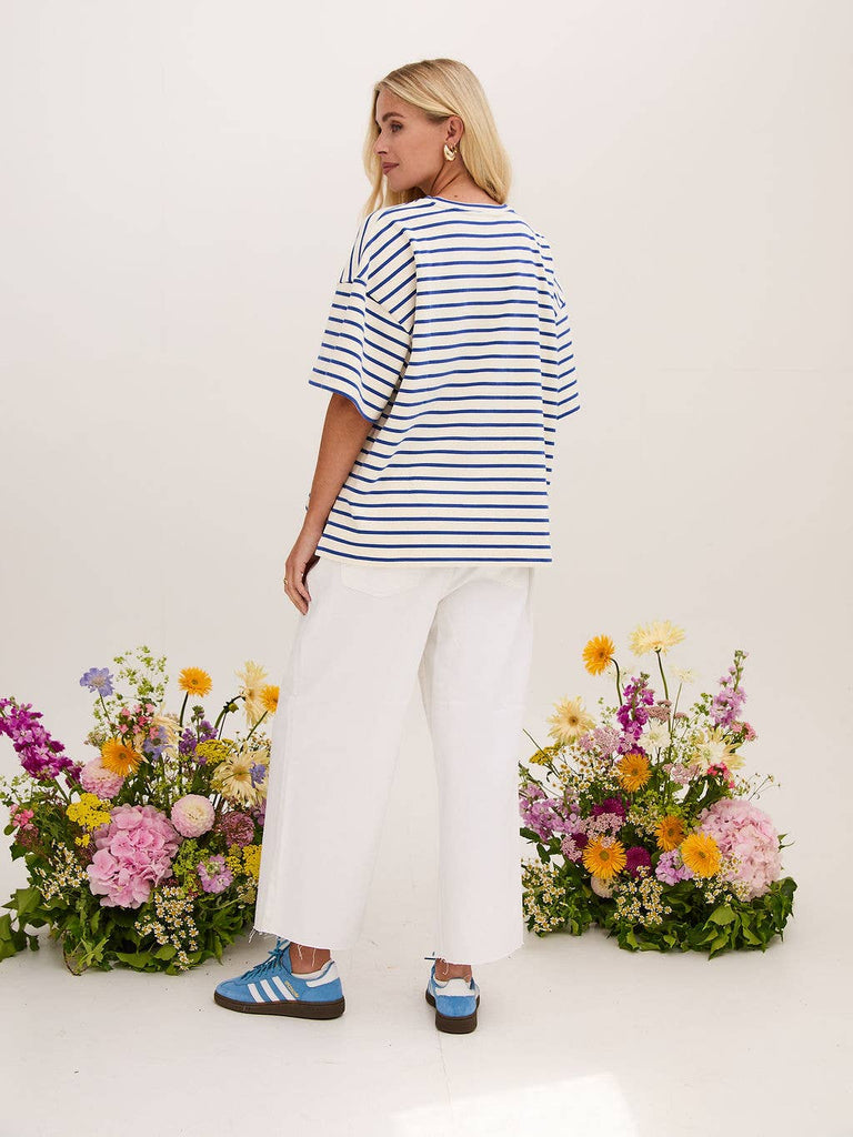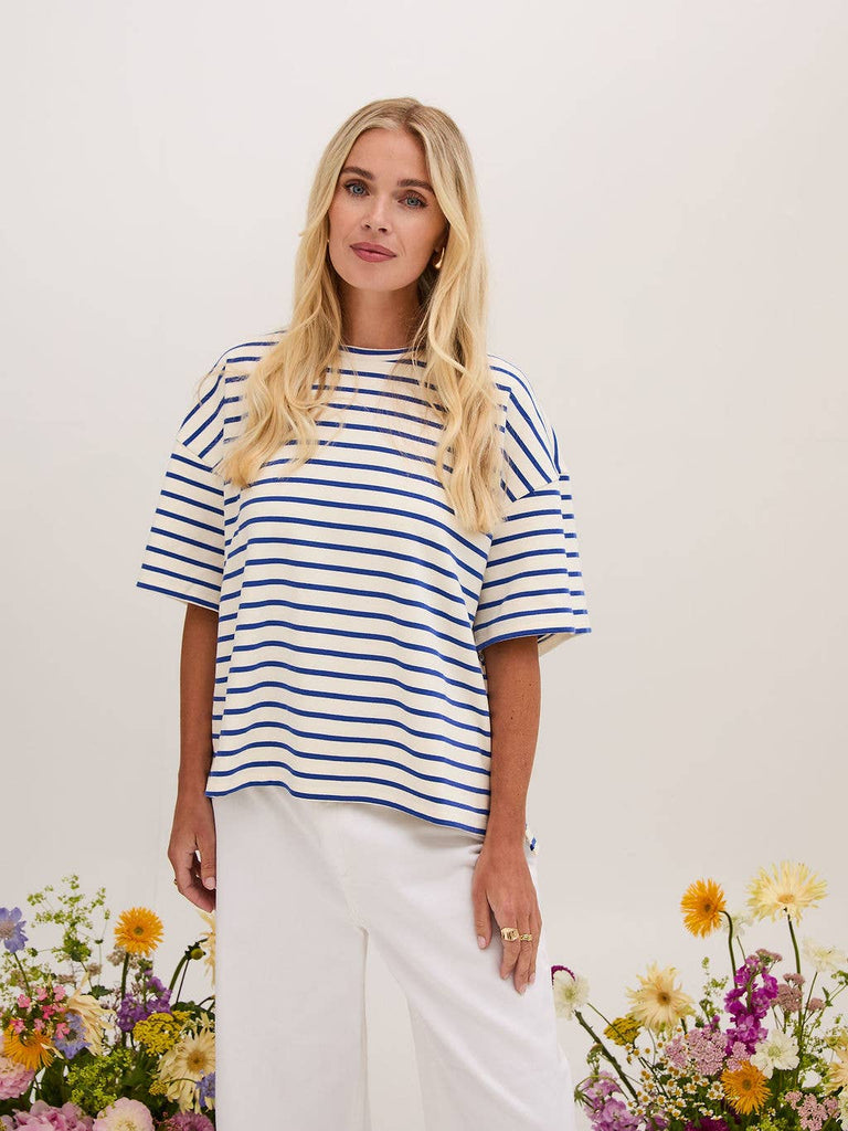 Our bestselling Sara tee is here in a new fresh blue and white stripe colour way. Crafted from premium cotton, this A-line t-shirt offers comfort, breathability and a flattering fit. Designed with subtle side splits for ease of movement and a relaxed drape. Perfect for everyday wear or layering under your favourite pieces.