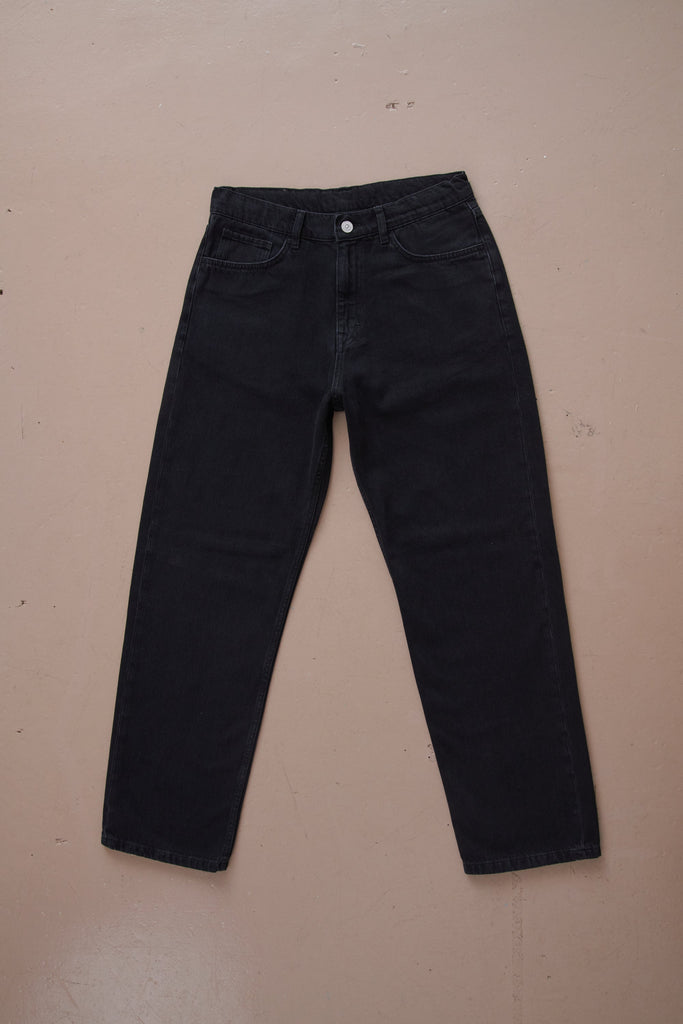 Stealth wealth. A relaxed jean with a long rise, loose tapered leg and 32" inseam. Made from a mid weight 12oz black denim in 100% cotton, rinse washed for softness while maintaining a deep black shade that will fade gently over time.