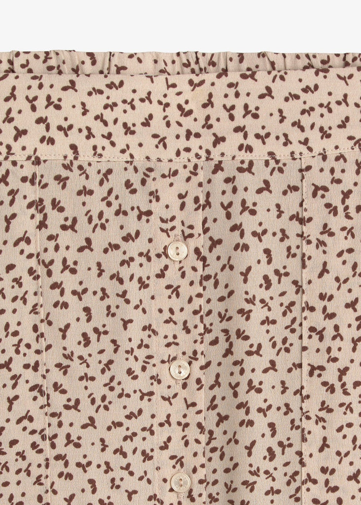Midi skirt with floral print in ecru and brown. Straight cut. Flowy design. EcoVero™ viscose crepe. Elastic waist at the back. Button front. Front slit. Two side pockets. Length: 77 cm (size S).