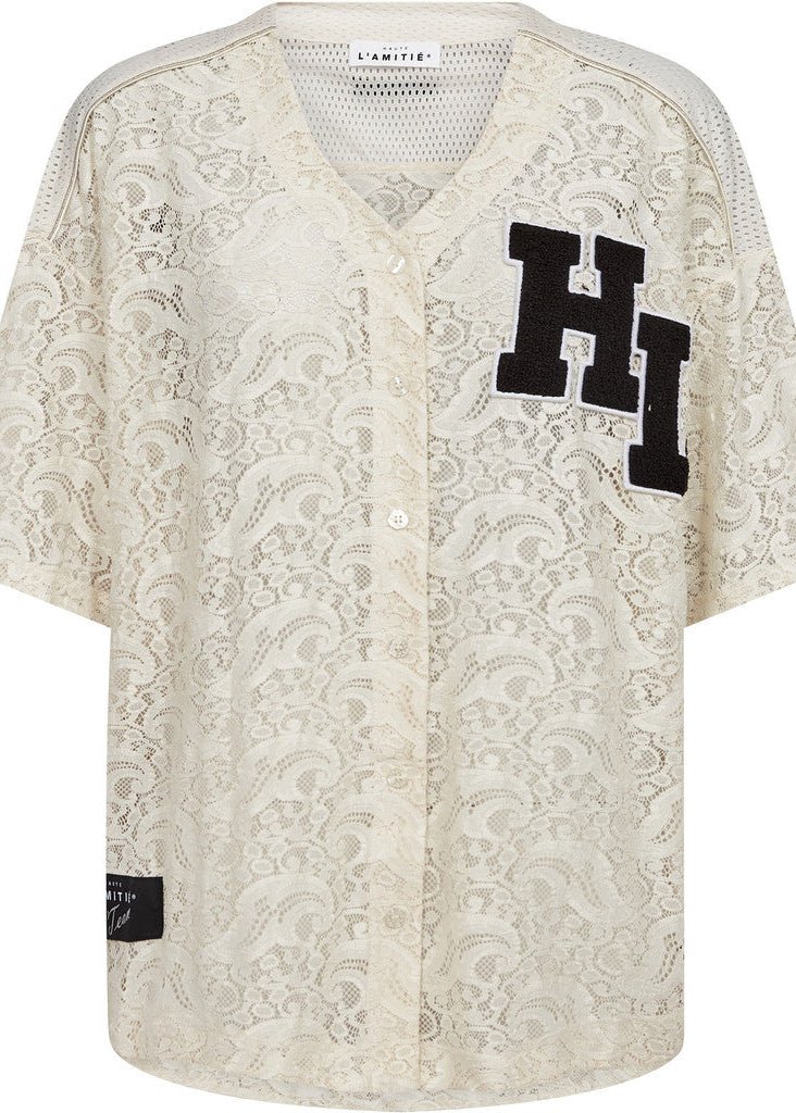 Sporty inspired, meet the new Haute L'Amitié Court Long Sleeve Lace Tee. Featuring an all over lace design, this relaxed shape top also features a varisty style motif on the front and v shaped neckline.